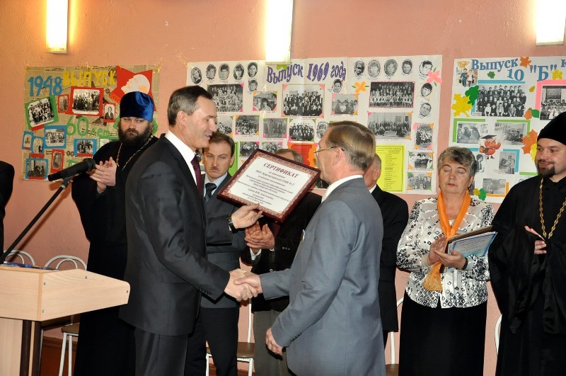 Поздравить школу с этим знаменательным событием прибыли почетные гости: руководители и представители духовно-просветительской социально-благотворительной акции Поезда «За духовное возрождение России» среди них Его высокопреподобие протоиерей Константин, председатель комитета по общественно-политическим и религиозным связям правительства Новосибирской области Лымарь В.Д.. А также начальник управления образования Дулуба С.А., представители районного Совета депутатов, Совета Ветеранов, художественно-краеведческого музея, заместители директоров школ района.